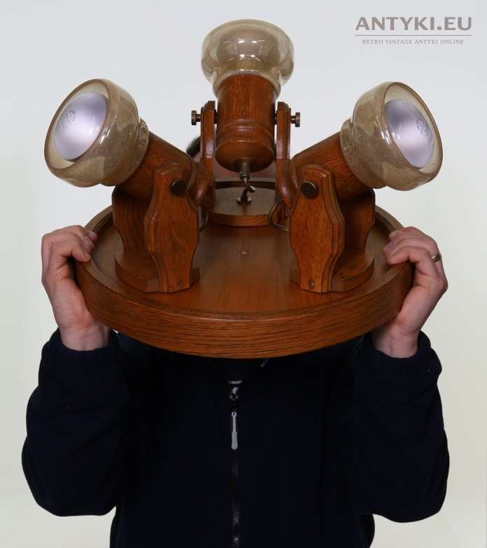 Nie jest to żadna sklejka ani lekka imitacja – to masywny, ciężki egzemplarz z prawdziwego drewna dębowego, o wyraźnym usłojeniu i solidnej stolarskiej konstrukcji. Charakterystyczną cechą są trzy niezależne, w pełni regulowane punkty świetlne, które można obracać w górę, w dół i na boki – praktycznie w każdym kierunku.