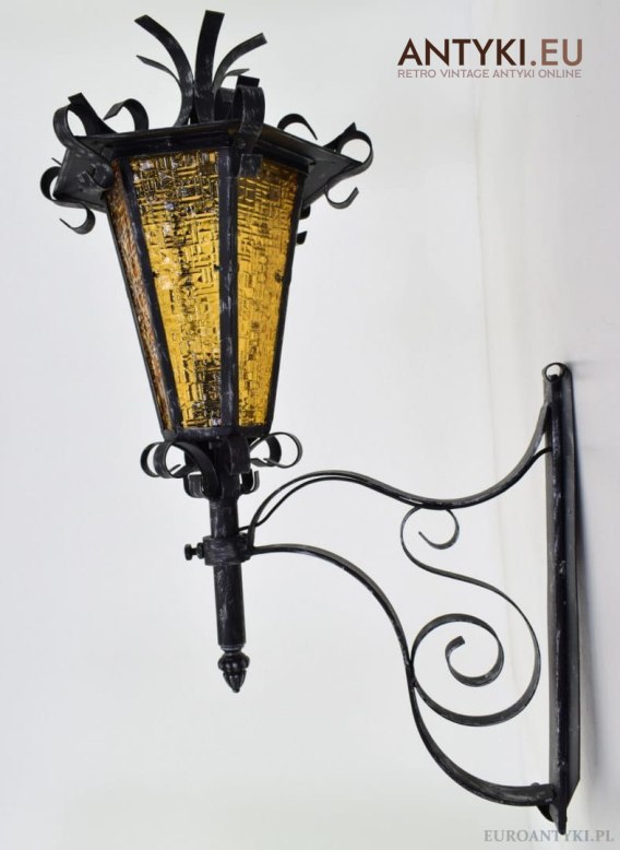 XL – duża lampa zewnętrzna w formie klasycznej latarni elewacyjnej (kinkiet przydrzwiowy), kupiona na giełdzie antyków i staroci w Austrii. Wykonana z metalu (solidna, ciężka konstrukcja) oraz wyposażona w oryginalne szklane szybki – dają bardzo przyjemne, ciepłe światło (szkło w odcieniu bursztynowym / miodowym). Sprowadzona z Francji, pochodzi z drugiej połowy XX wieku.