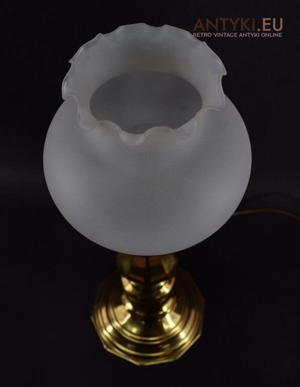 Ponadprzeciętna lampka wykonana z masywnego mosiądzu ( 2kg! ). Szklany florystyczny klosz - matowy kwiatowy kielich.