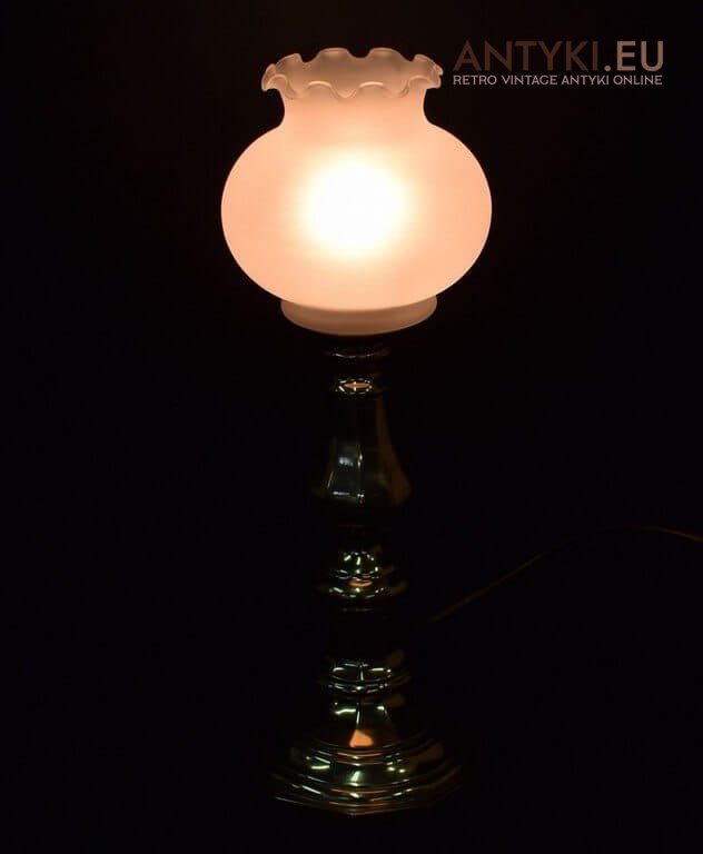 Powierzchnia starej lampy wygląda bardzo szlachetnie, ma delikatny nalot patynę, widać że lampka ma swoje lata, aczkolwiek nie ma żadnych uszkodzeń typu wgniecenia, pęknięcia, zarysowania itp. Nie wygląda jak odlana mosiężna noga prosto z budowlanego sklepu. Dlatego antyki to antyki i te osoby które kochają i czuja piękno, wiedza o co chodzi. Lampka ma szeroką nogę i dzięki temu stoi bardzo stabilnie.