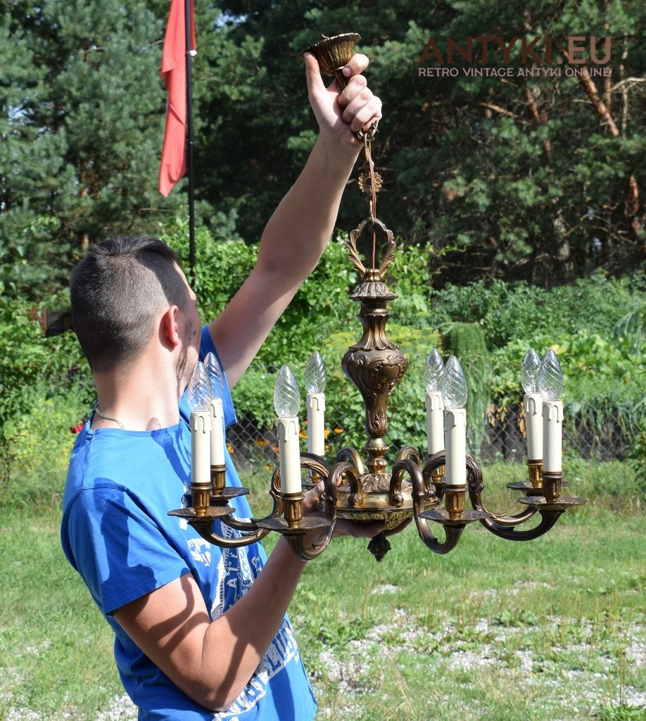Zabytkowy, mosiężny żyrandol salonowy. Antyczne lampy.