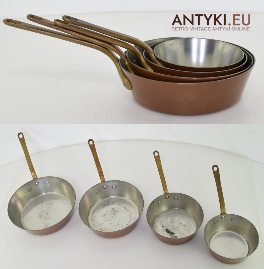 Zestaw antycznych miedzianych patelni