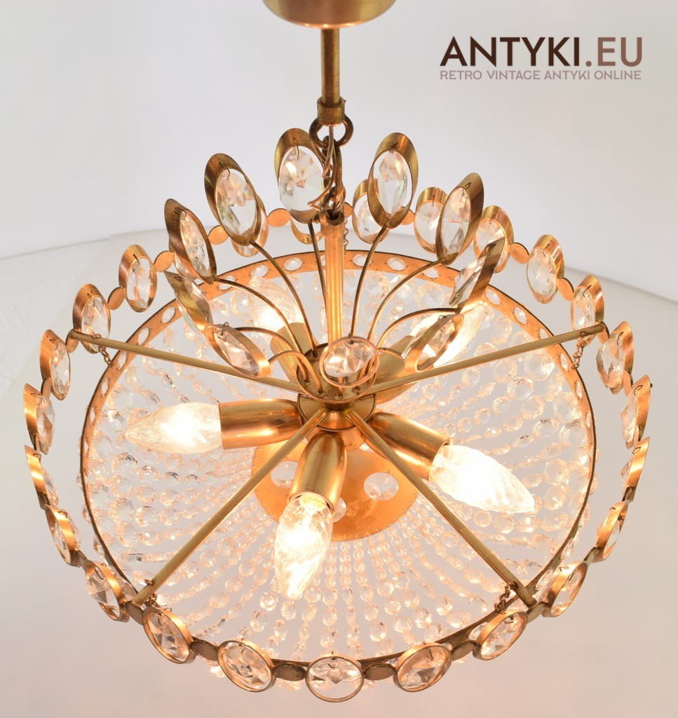 Sprowadzony z Austrii. Pochodzi z połowy XX wieku. Wykonany z mosiądzu i prawdziwych kryształowych zawieszek. W promieniach słońca kryształy tworzą niezwykłe, wręcz niezapomniane efekty świetlne. Niestety ciężko to uwiecznić na zdjęciach, ale na żywo wygląda to ślicznie! Kryształki w super stanie, kompletne - 100% OK.
