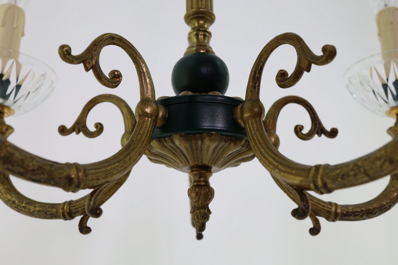 - Kryształowe żyrandole z mosiężnymi zdobieniami.